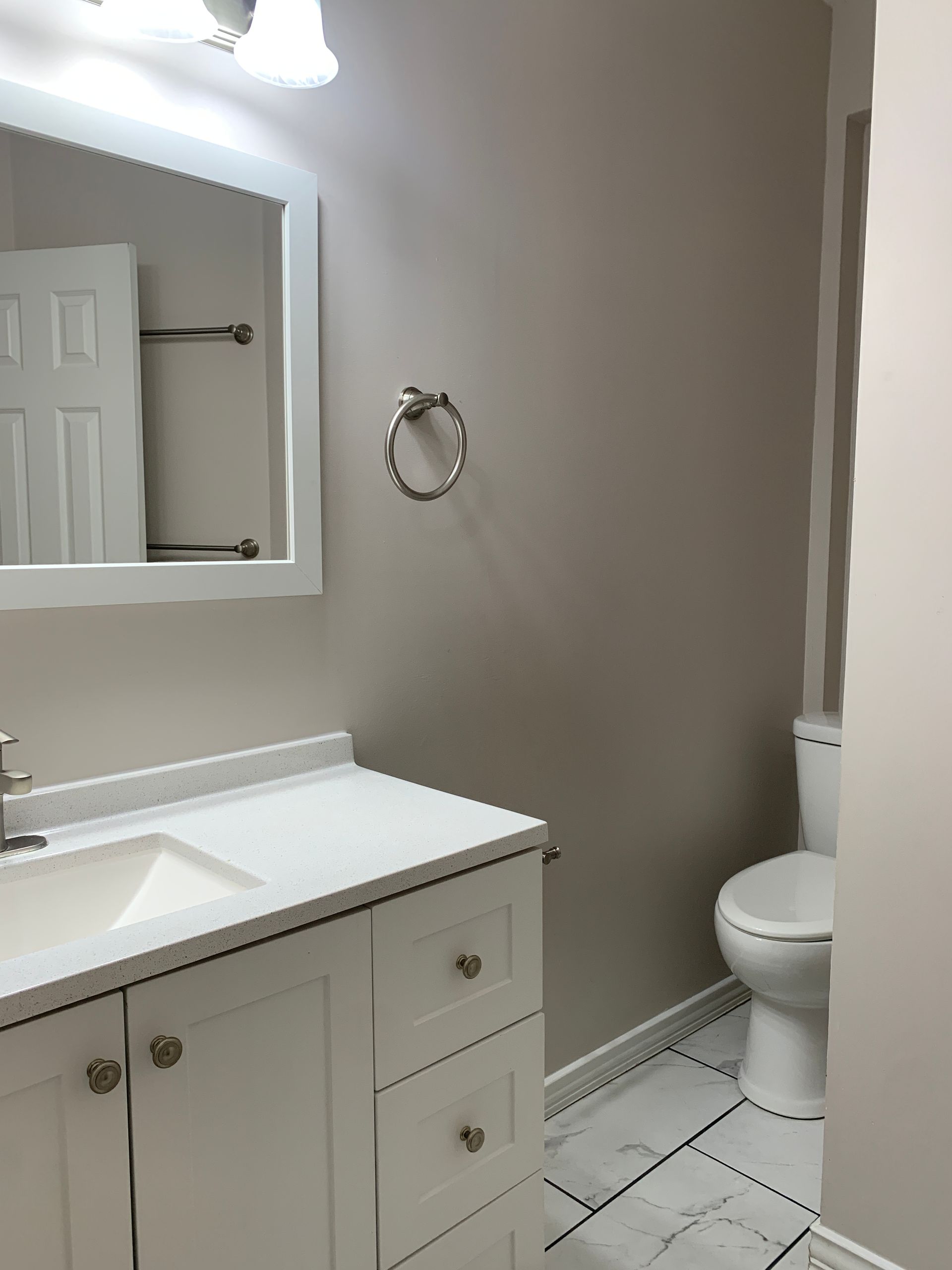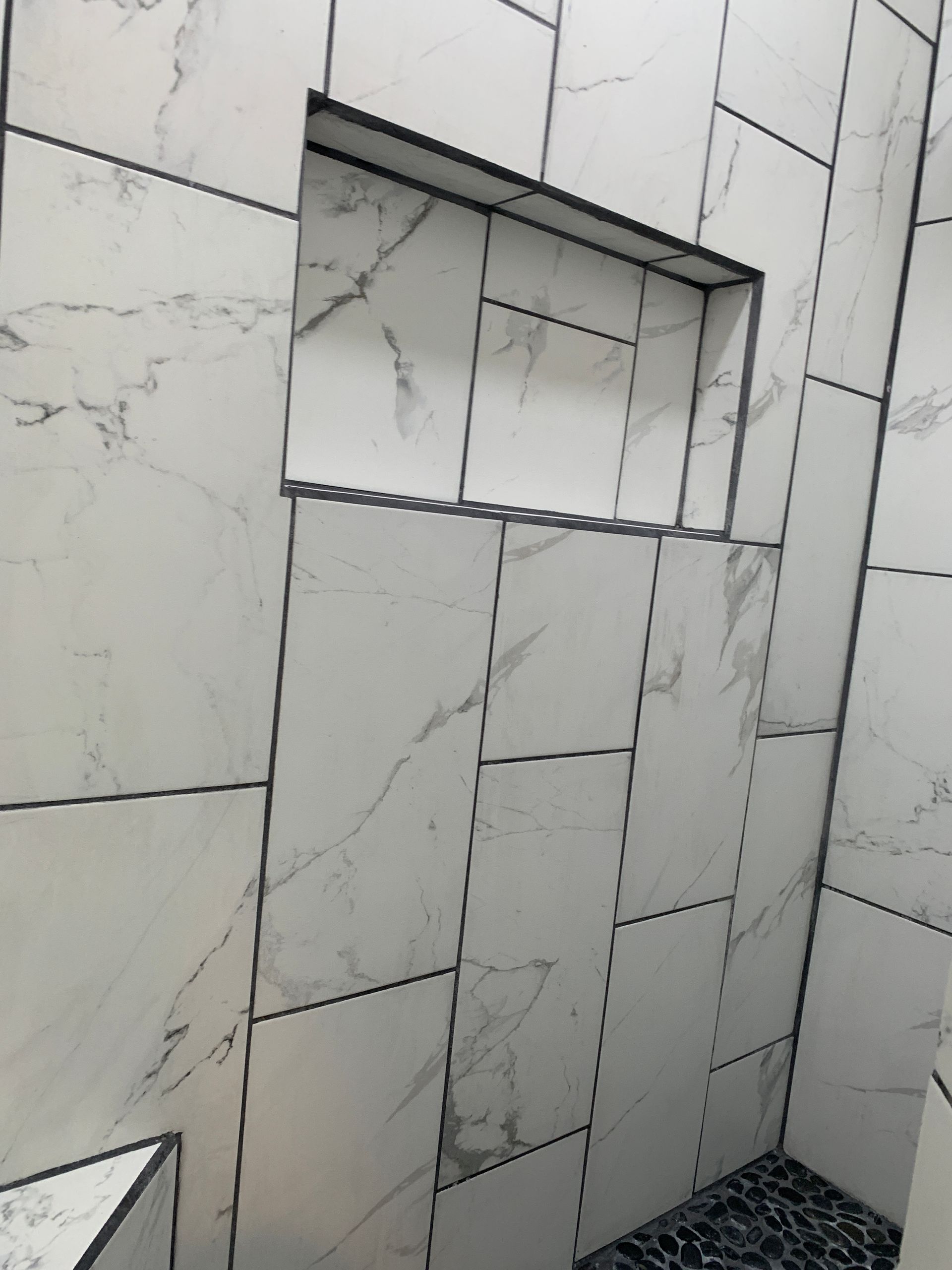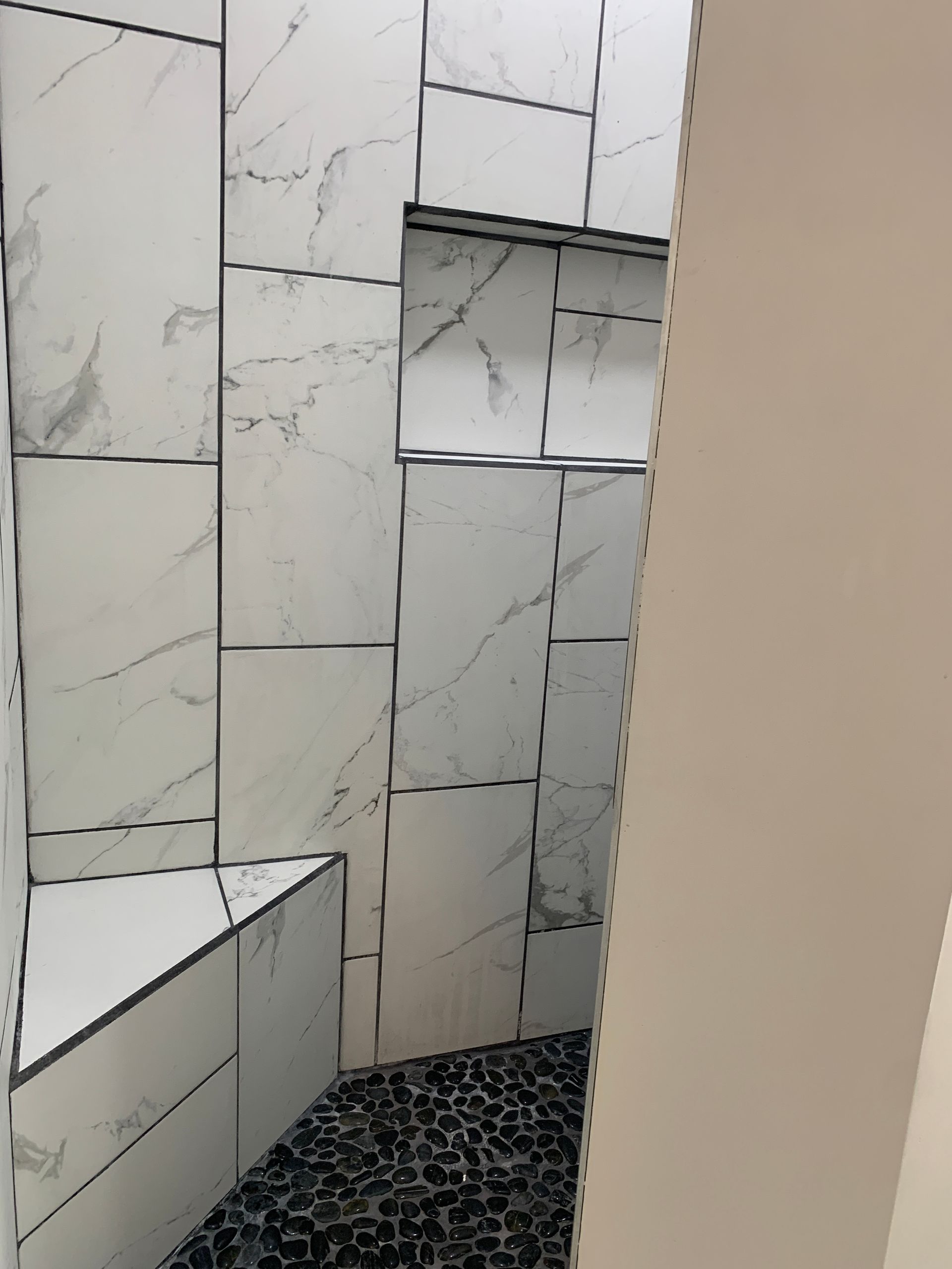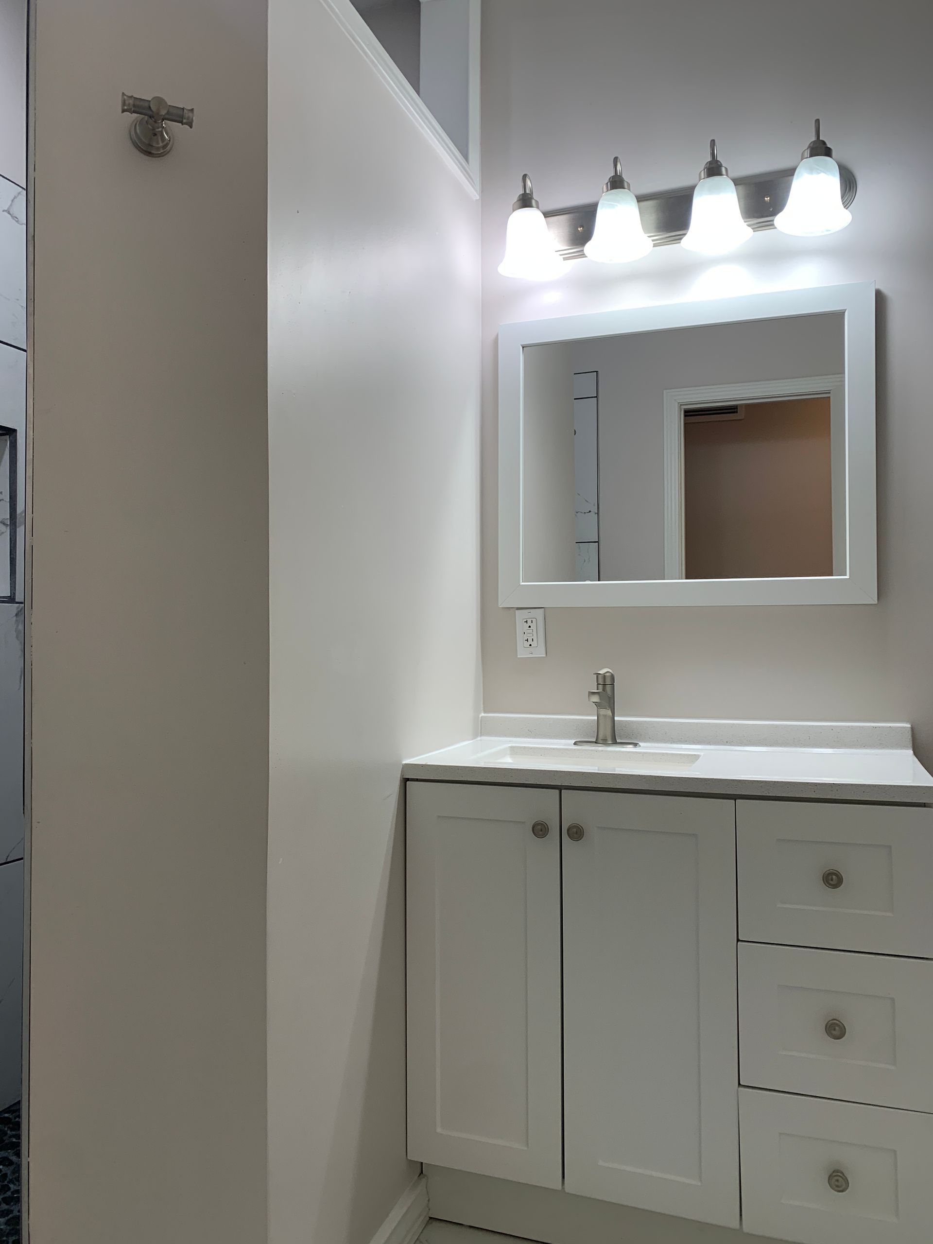 The bathroom is a true retreat, complete with stylish stone flooring and a rain shower for a spa-like experience.