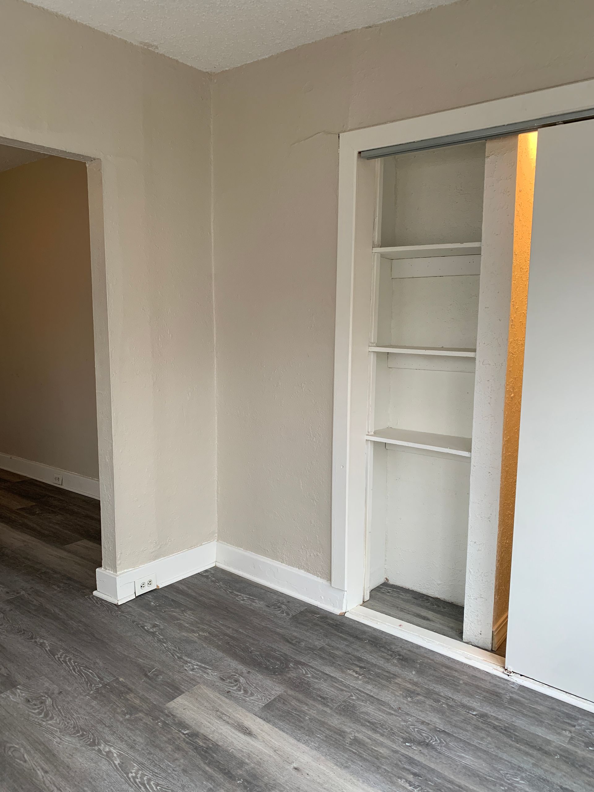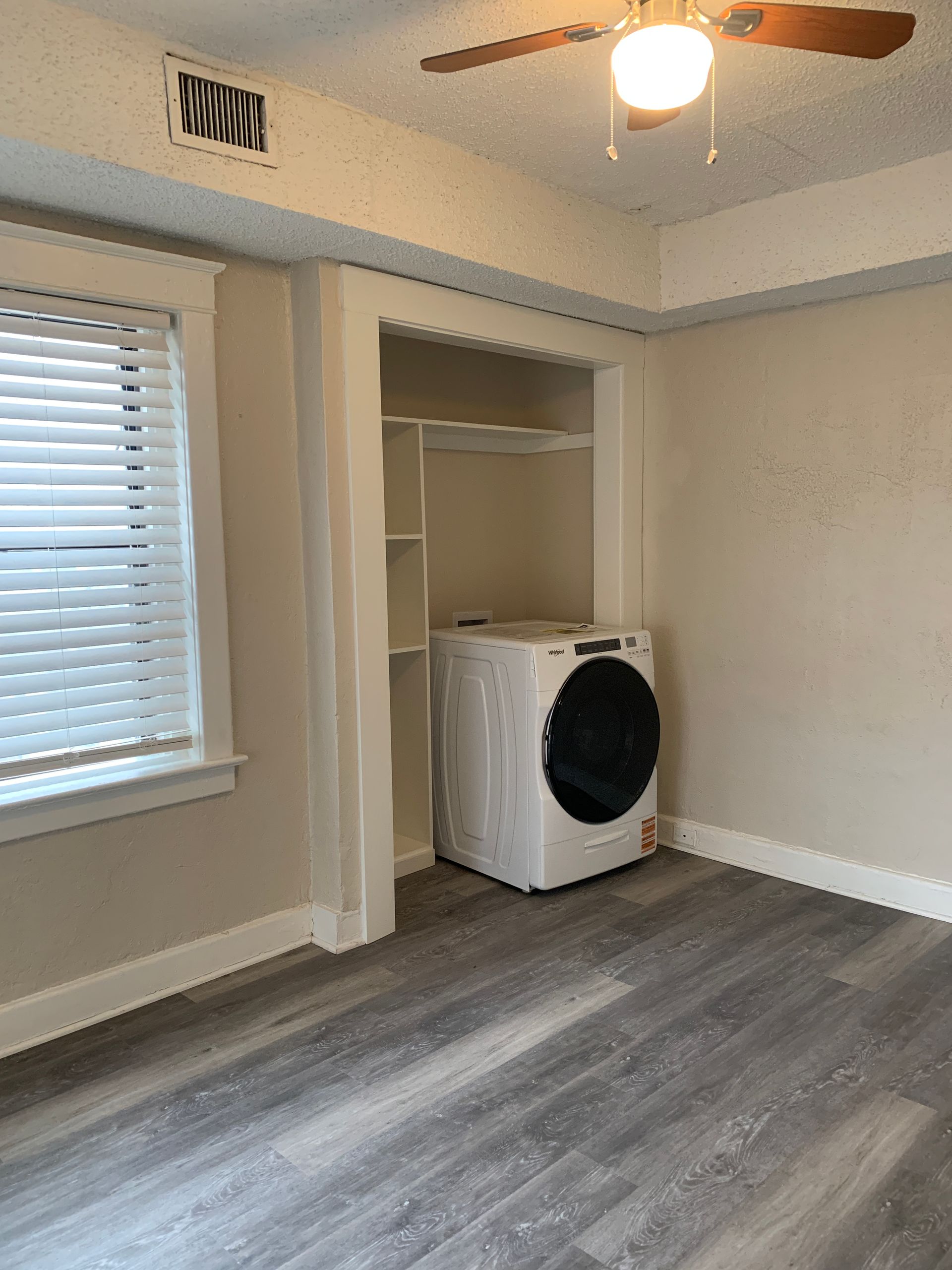 This one-bedroom features two areas great for bedroom and office space or seating area, a walk-in closet with built-in shelving, and a unit laundry.