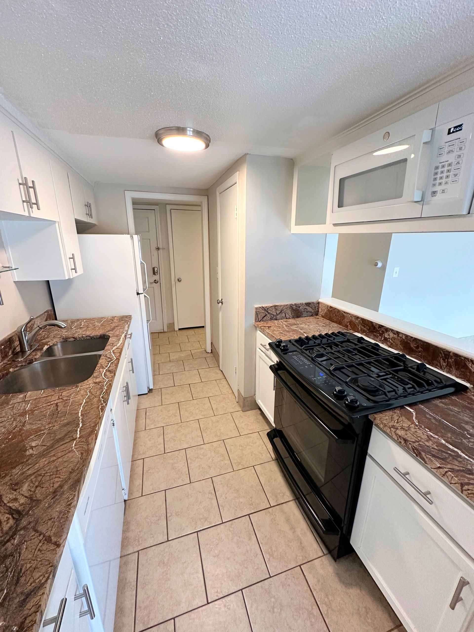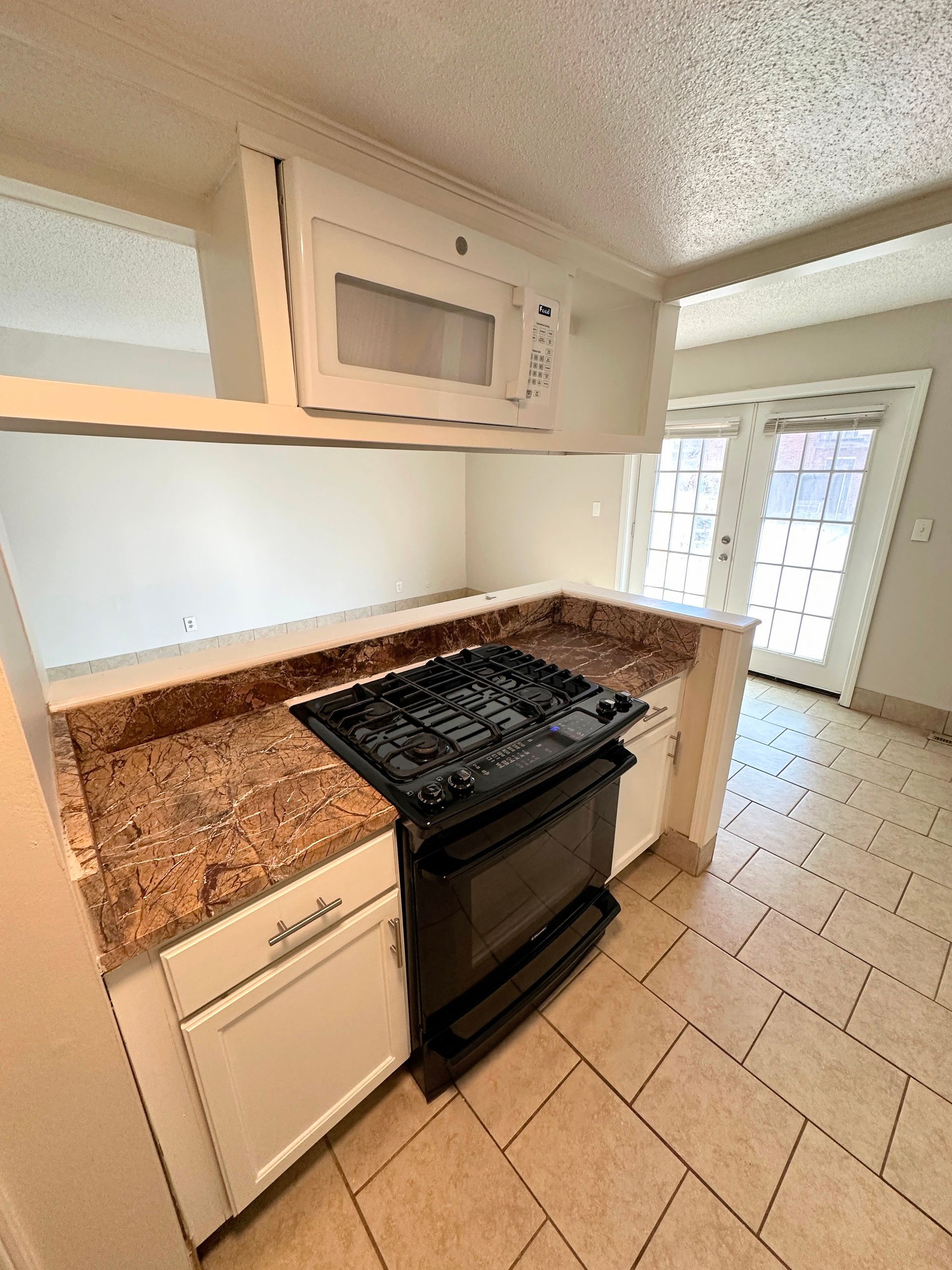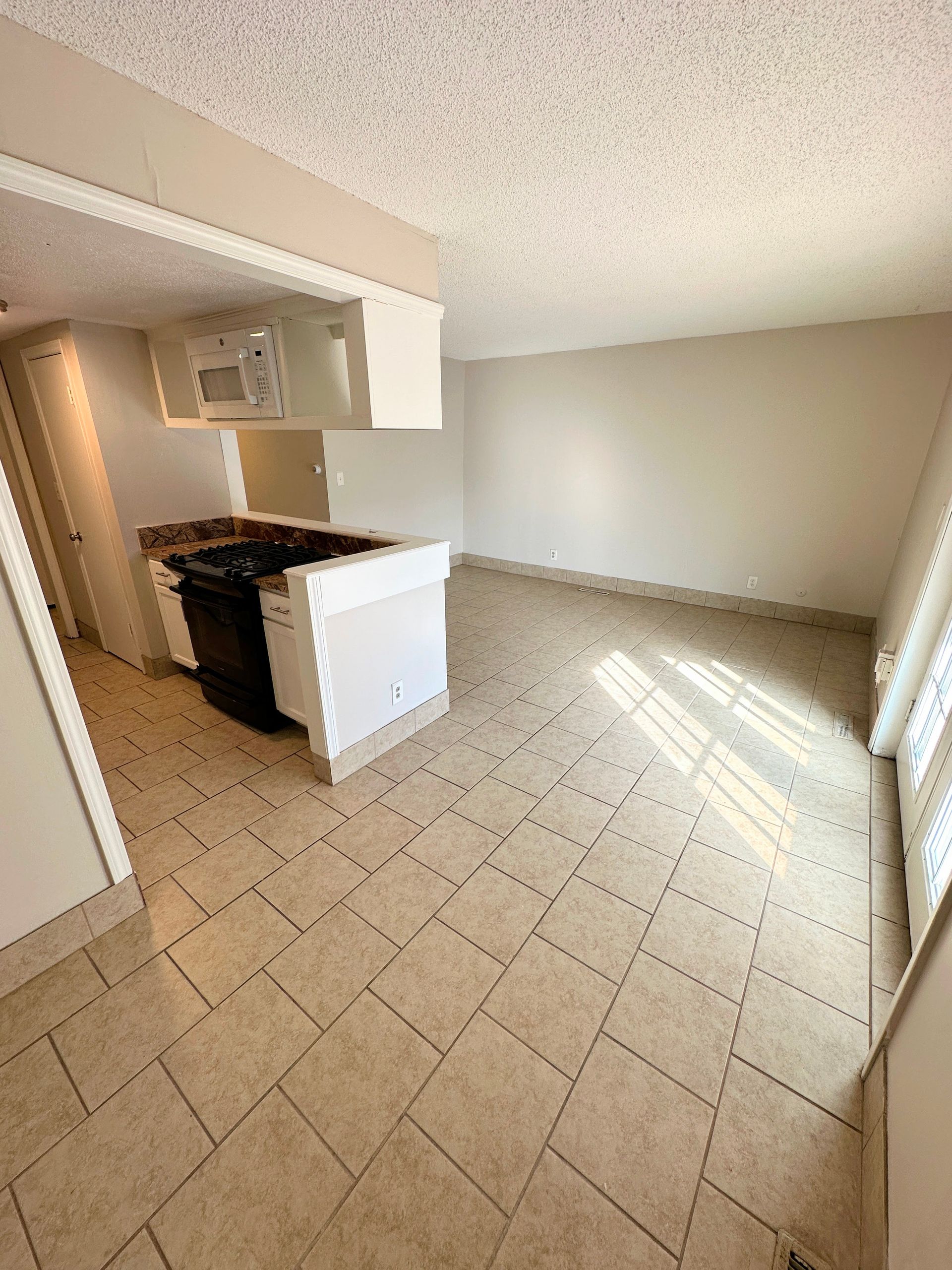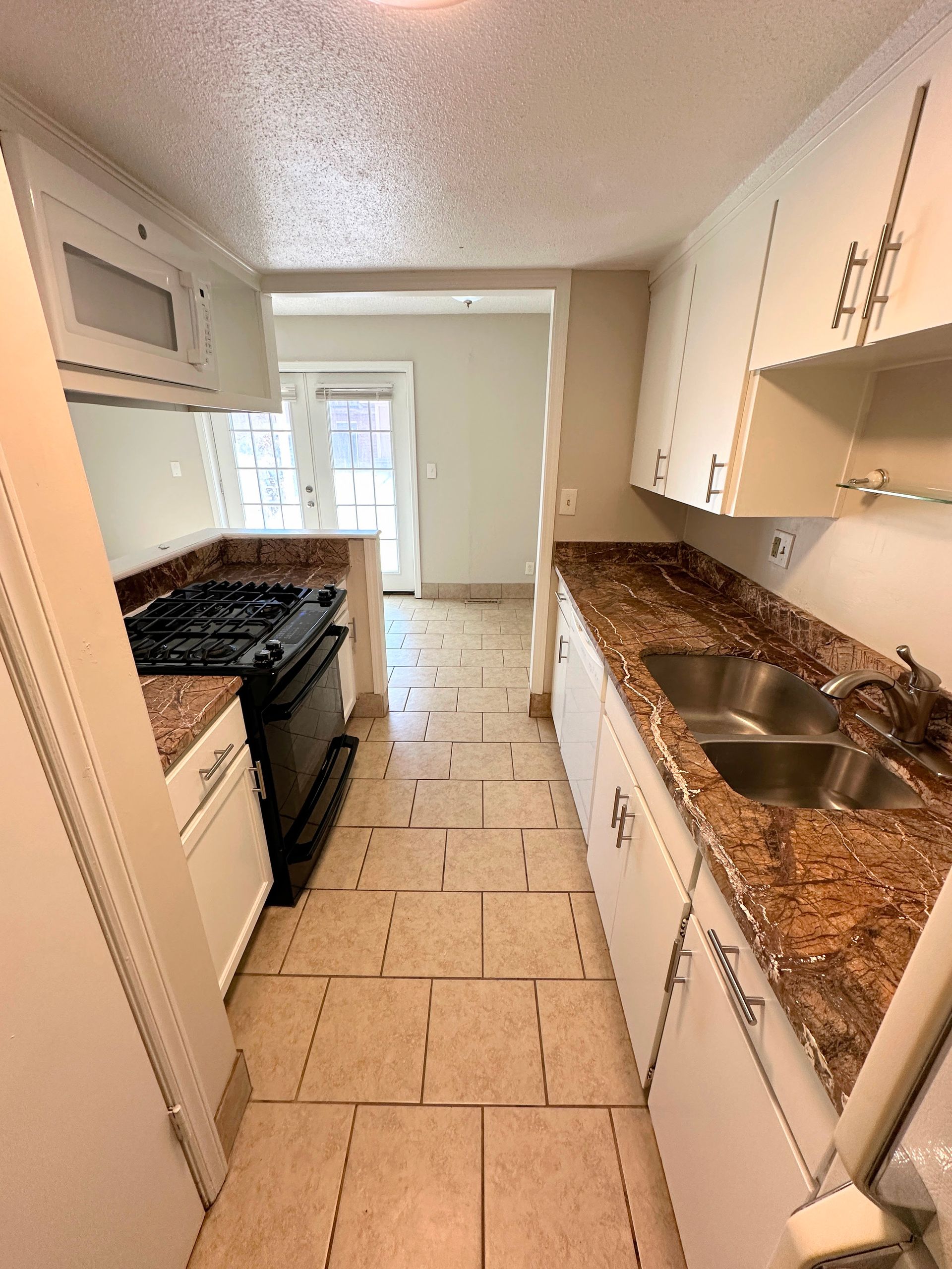 This 1BR features tile throughout and carpeted bedroom, spacious kitchen fully equipped with microwave, dishwasher, and gas range, separate living and dining area, new double vanity in the bathroom, double closets in the bedroom, plus two additional storage closets and central heat/air. French doors leading to the shared patio space overlooking the pool!
